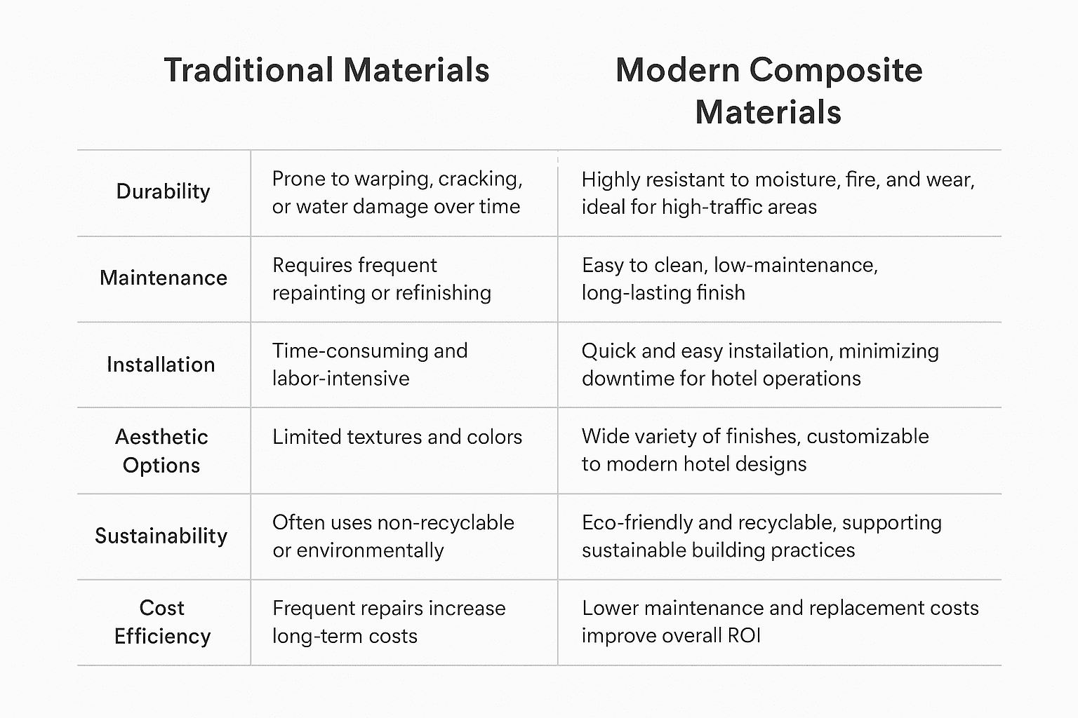 โรงแรมต่างๆ หันมาเลือกใช้วัสดุตกแต่งภายในที่เป็นนวัตกรรมใหม่ซึ่งผสมผสานสไตล์ ความทนทาน และความยั่งยืนเข้าด้วยกันมากขึ้น เมื่อเปรียบเทียบกับไม้และหินแบบดั้งเดิม แผงคอมโพสิตสมัยใหม่ พื้น SPC และแผงทำความร้อนคริสตัลคาร์บอนมีข้อดีหลายประการสำหรับพื้นที่เชิงพาณิชย์