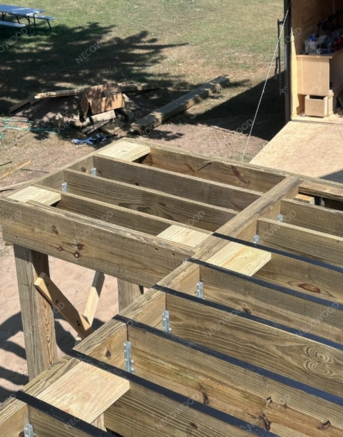 The Millers ติดตั้งสำรับใหม่ในเวลาเพียงสองวันโดยใช้ไฟล์ระบบคลิกล็อคที่ไม่จำเป็นต้องใช้กาวหรือเล็บ การนำกลับมาใช้ใหม่ของ Joists ดั้งเดิมช่วยลดขยะการก่อสร้างและประหยัดค่าใช้จ่ายในการสาธิตมากกว่า $ 1,200